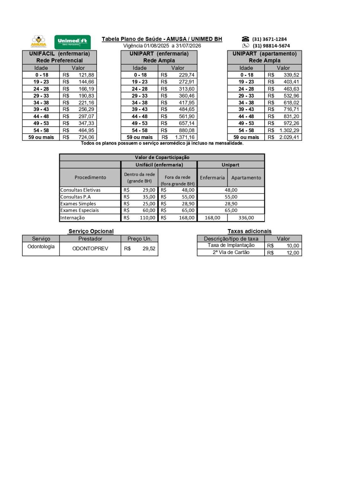 Atendimento na rede Unimed e credenciados na rede Unifácil) – Funcionários efetivos pagam 5% dos vencimentos*; Os demais não têm ajuda da prefeitura, pagamento integral de acordo com a faixa etária na tabela vigente.